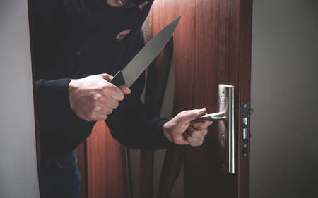 Masked thief using lock picker to open locked door
