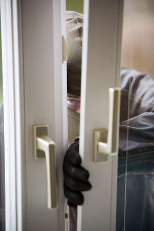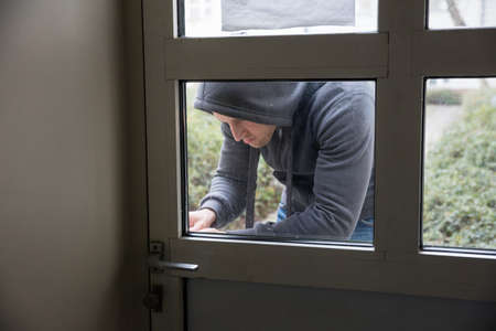 Young robbery man entering to house through the window