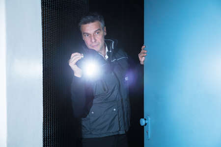 Male Security Guard Using Flashlight Checking Outside The Warehouse Door