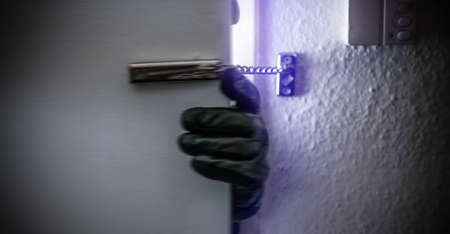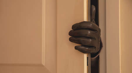 Housebreaking, burglary concept. Gloved hand opening the entrance door, burglar entering illegally the house