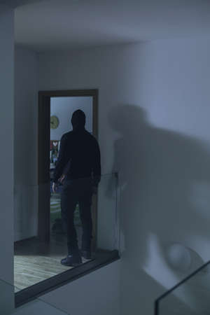 Image of thief silhouette with gun standing behind internal doors