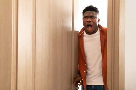 Shocked African American Man Opening The Door Standing At Home