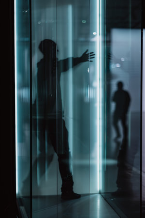 A silhouetted figure presses their hand against a vertical glass panel illuminated with cool-toned light. The scene creates a reflective and mysterious atmosphere, human form behind glass.