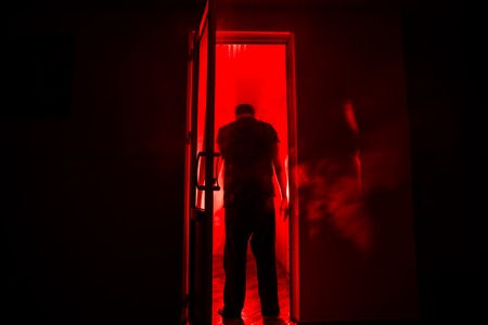 Dark corridor with cabinet doors and lights with silhouette of spooky horror man standing with different poses. Halloween concept
