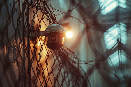 Close up view of security camera hanging among barbwire in prison or other guarded object.