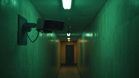 AI surveillance camera monitoring entrance sleek design tense atmosphere dimly lit corridor overhead view