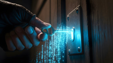 A hand in a black glove inserts a key into a futuristic lock emitting blue binary code....