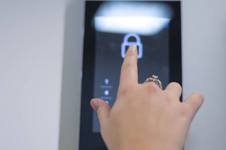 Young businesswoman entering access code at building entrance. The smart home system with access control for entering a PIN code. A hand is typing a combination on the keyboard.