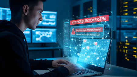 A person in a dark room uses a laptop to detect a suspicious intrusion attempt on a digital network.