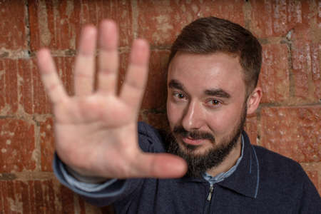 Man showing interlocutor hand gesture to keep distance. Guy keeping distance with hand. Male showing stop gesture. Safe life from coronavirus. Quarantine, social distance. Selective focus on hand