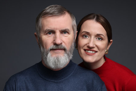 Love and relationship concept. Happy adult couple hugging, smiling wide and looking at camera, standing together on blue abstract background