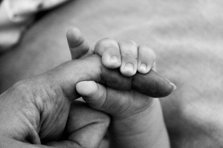 Mother and daughter holding hands. close-up. flat lay. Black and white colors. The concept of caring for the elderly.