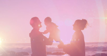 Image of light spots over happy caucasian couple with baby at beach. fathers day and celebration concept digitally generated image.