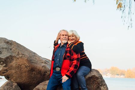 Cheerful elderly people a woman and a man are sitting on the stones and hugging on the lake, against the background of the bridge