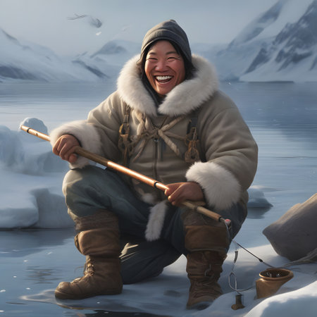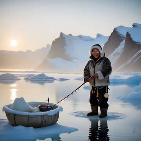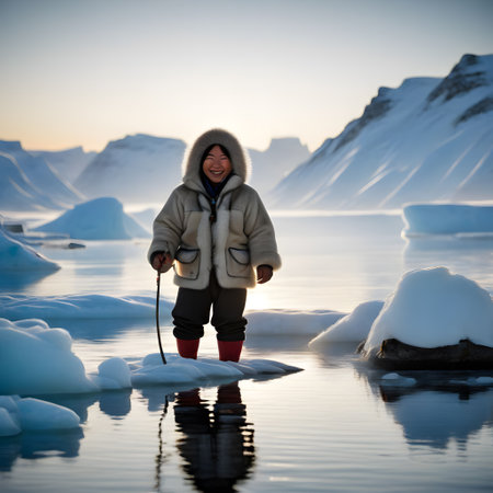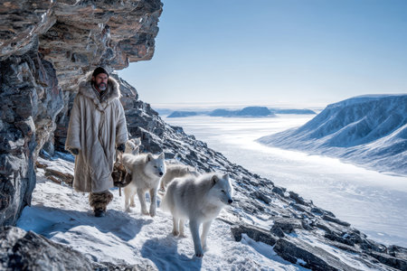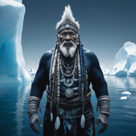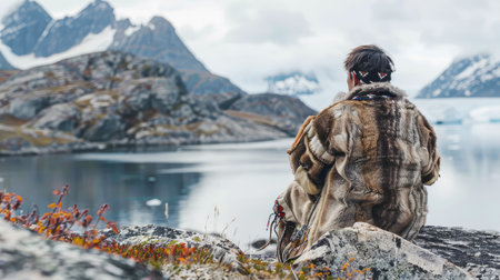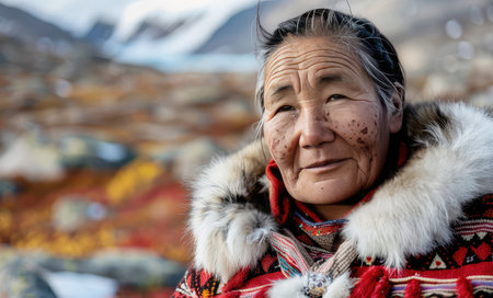 The portrait of an old Greenlander dressed in traditional clothing represents a deep connection to the Arctic landscape and the rich traditions of the Inuit people