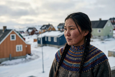 Young greenlandic woman with braided hair wears a colorful traditional beaded collar while standing outside near wooden houses in a snowy arctic settlement during a cold winter day.