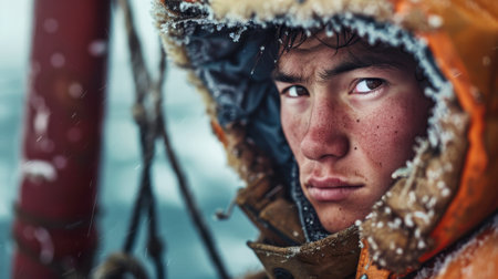 Focused close-up portrait of a young Eskimo male fisherman with a determined expression in a snowy setting
