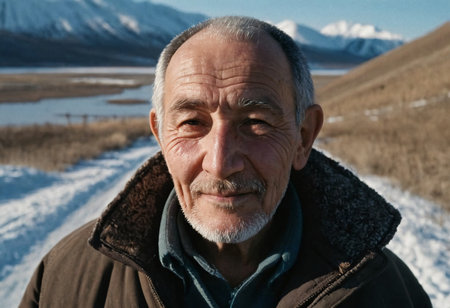 A wise Chukchi man stands proudly against the stunning backdrop of Chukotka's snow-covered mountains, reflecting a lifetime of experience and tradition in his warm smile.