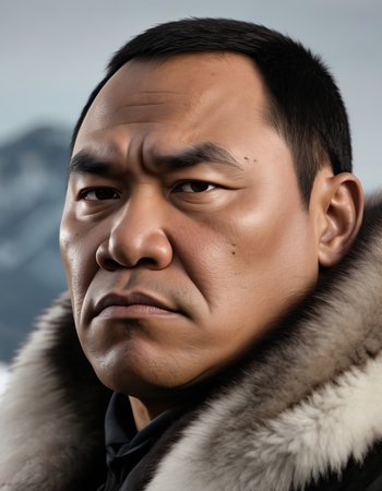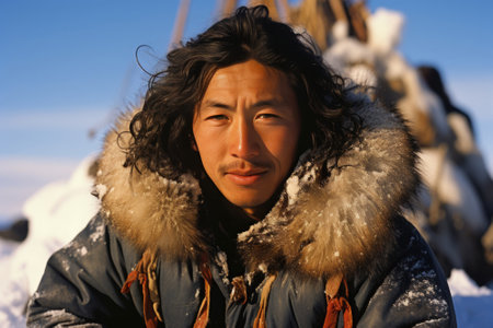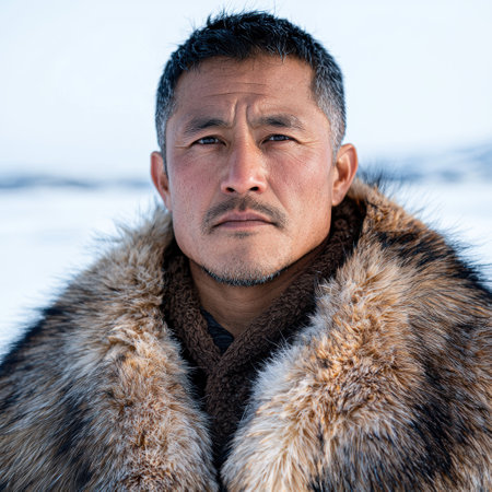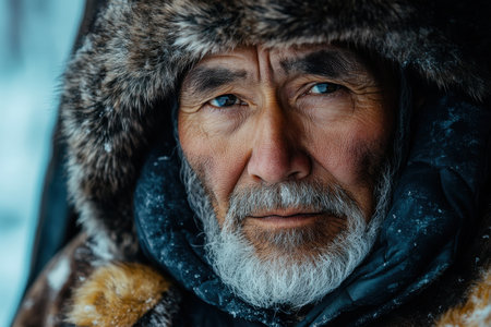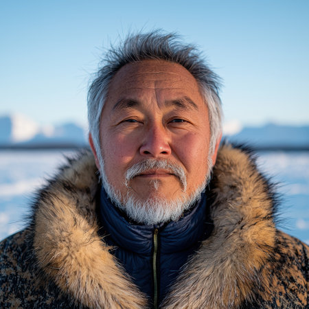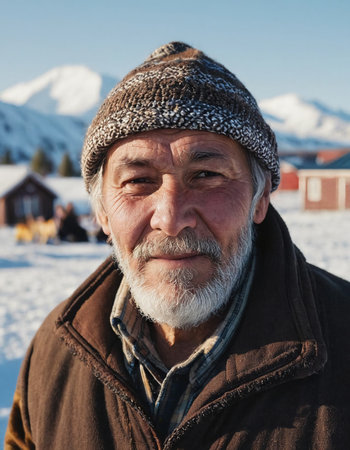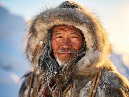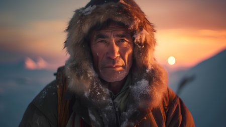 A wise Chukchi elder stands proudly in the snowy wilderness of Chukotka. His weathered face tells tales of resilience against the harsh Arctic climate.