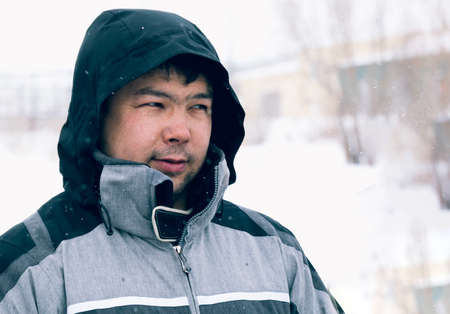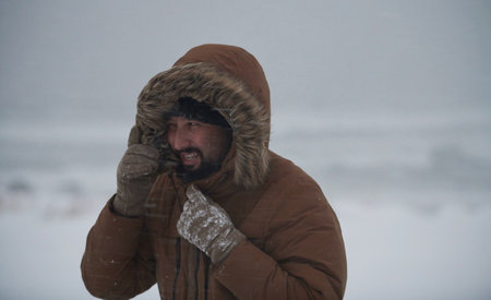 man at winter in stormy weather wearing warm fur jacket