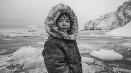 Black and white portrait of an Inuit child in a fur coat, standing on an icy shore in a harsh winter landscape