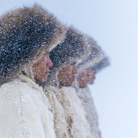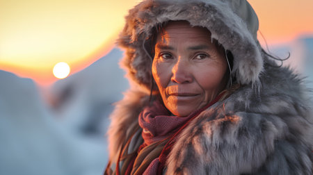 An elderly woman in traditional fur-lined clothing gazes pensively at a vast, snowy landscape, embodying resilience and connection to nature.