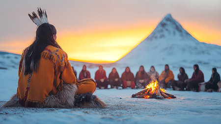 Elderly Inuit Couple in Traditional Clothing from Greenland. Generative AI illustration.