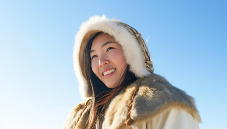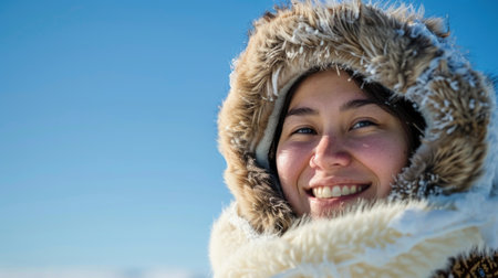 Smiling Eskimo woman wearing traditional clothing in wind against clear blue sky