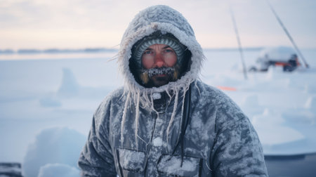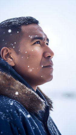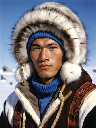 A Chukchi young man stands against the snowy backdrop of Chukotka, embodying the rich cultural heritage and connection to the harsh Arctic environment Generative AI.