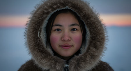 An elderly Inuit woman gazes warmly from within her fur parka hood, her kind eyes reflecting the surrounding icy landscape and gentle daylight, embodying wisdom and resilience.