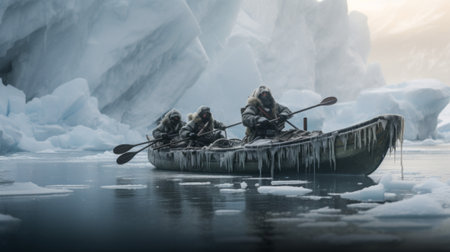 An AI illustration of a team of sailors navigating their boat through a glacial landscape.