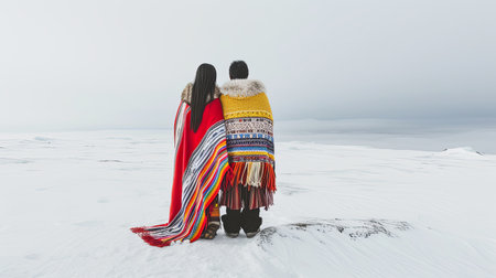 An AI generated illustration of An AI-generated illustration of Two individuals in cultural attire pose on snowy terrain