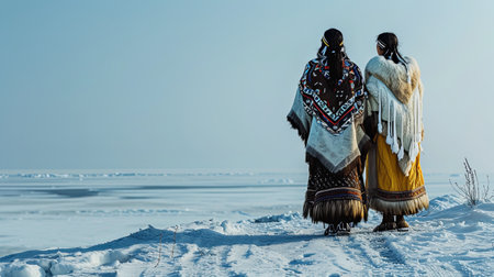 An AI-generated illustration of Two individuals in cultural attire pose on snowy terrain
