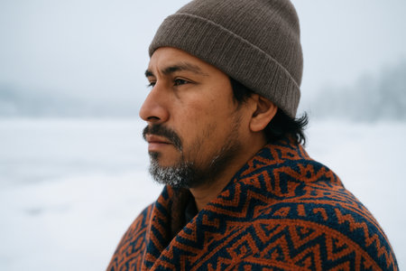 Thoughtful man wearing patterned blanket and beanie gazing into distance in quiet snowy winter outdoor landscape.