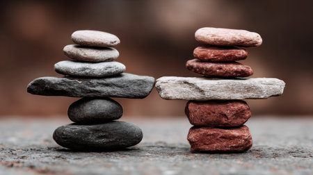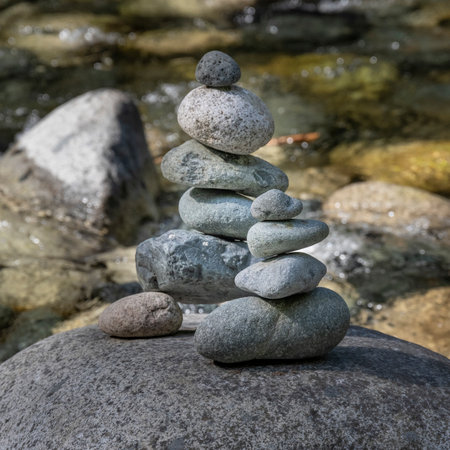 Calm zen artwork capturing equilibrium and peace via meticulous arrangement and subtle dawn glow in muted blue-gray hues. Suited for wellness websites, yoga retreat promotions, mindfulness journals, therapy office decor, or motivational posters emphasizing inner strength. Precise shading and fluid forms enhance adaptability for editorial layouts, app icons, or brandi... AI-generated illustration.
