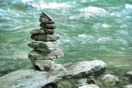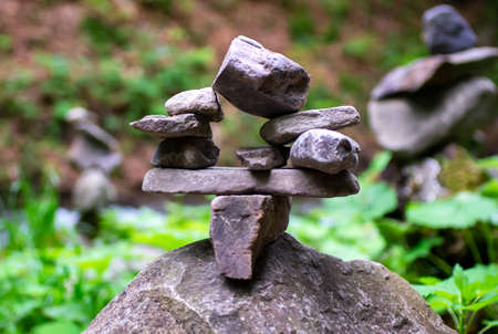 soft focus, Close-up of a stack of stones in perfect balance in a mountain forest. Rock pyramid, rock balancing art. Meditation, balance, peace. Hobby.