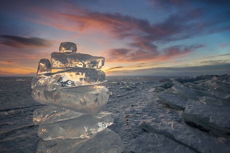 Sunset reflected in a large block of ice hummock on the frozen lake background.
