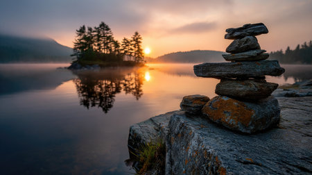An AI generated illustration of Rocks artfully stacked near a serene lake, framed by lush foliage