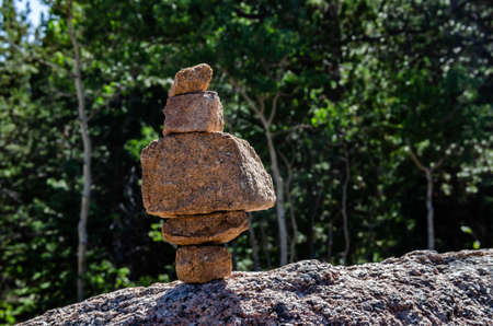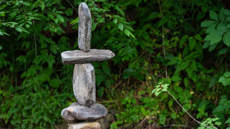 Stone balancing sculpture is standing on a rock, representing balance and stability