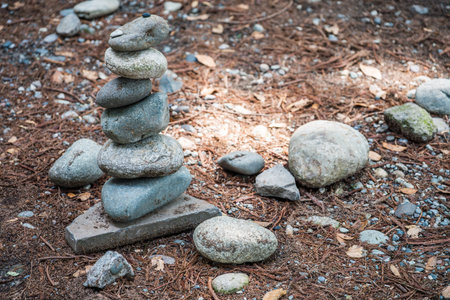 A carefully arranged tower of smooth stones stands prominently in DuJiangYan, Sichuan province, China. Each stone is meticulously balanced on top of one another, showcasing the skill and patience involved in this traditional practice. Surrounding the tower are various sizes of natural rocks and pebbles scattered across the forest floor, intermingled with dried pine needles.