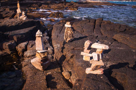 A stack of round stones standing on the shore of a sea Rocky coast at Khao Laem Ya Mu Ko Samet National Park Rayong, Thailand in sunset time