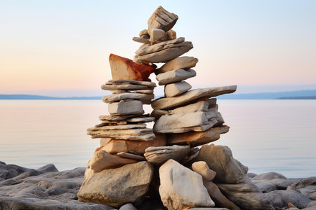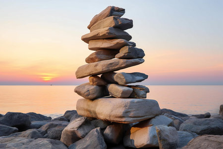A carefully constructed stack of smooth stones stands in perfect balance on a rugged cliff, a symbol of stability and mindfulness against the backdrop of restless ocean waves. This serene scene captures a moment of peace and harmony found in natures raw beauty.