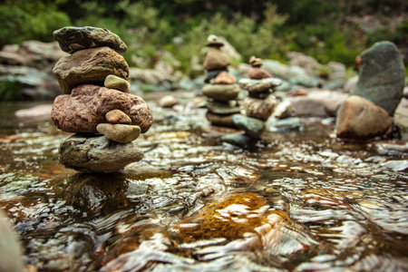 Rough Stone Cairns Standing Proudly in the Shallow Creek Water