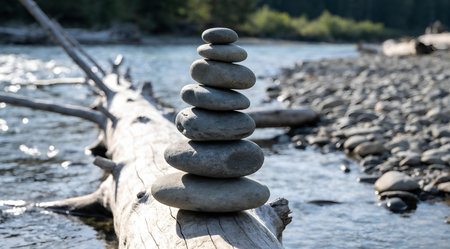 AI Generated. a stack of smoothe pebble stones by a serene lake