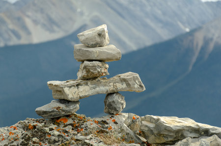 Medium shot of Inukshuk in Canada, British Columbia, Canada. Inuksuk made with piled stones to communicate, navigation. Forestry mountains background