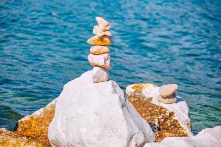 Pyramid stones on the seashore on a sunny day on the blue sea background. Happy holidays. Pebble beach, calm sea, travel destination. Concept of happy vacation on the sea, meditation, spa, calmness.