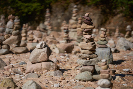 River pebbles and stones arranged in tower structures on the shore