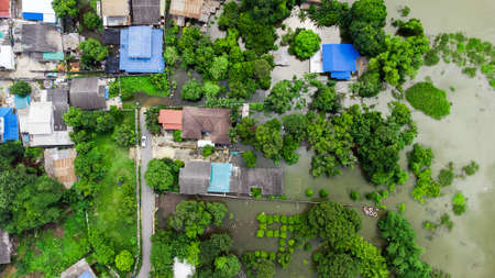 Top view of the disaster site. Houses in the village are flooded with water up to the roofs.