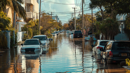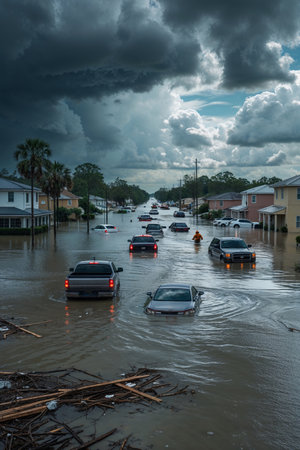 Severe urban flooding submerges cars on a residential street as emergency vehicles and responders work under dramatic storm clouds. Palm trees and houses line the scene, highlighting the impact of extreme weather.