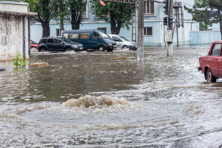 Odessa, Ukraine - May 28, 2020: driving car on flooded road during flood caused by torrential rains. Cars float on water, flooding streets. Splash on car. Flooded city road with large puddle